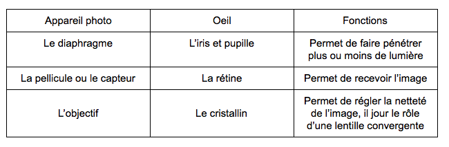 L’œil est l’organe de la vision, il nous permet de capter la lumière de notre environnement. D'un point de vue physique, l’œil est tout d’abord un objet optique qui modifie le trajet des rayons lumineux. Différents éléments permettent la formation d’une image. L’œil et l’appareil photo ont des composants aux fonctions semblables.